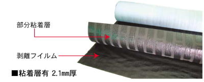 | 合成繊維を使用した改質アスファルトルーフィングをベースにして、裏面剥離フイルムを剥がすとストライプ状に粘着層が付いており、圧着することにより下地に部分接着する常温工法用絶縁ルーフィングです。部分接着により通気性が確保され、膨れ防止の効果を発揮します。さらに、1工程で2層分の施工ができ、防水層の破断・損傷を防ぎます。 |